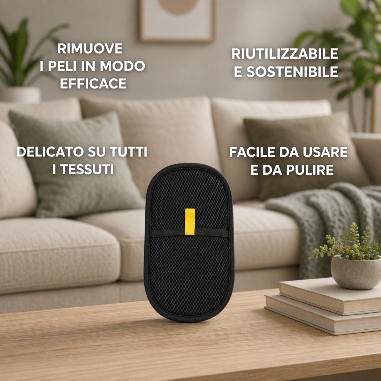 Il guanto riutilizzabile che elimina peli di animali, capelli e pelucchi da divani, letti e vestiti.