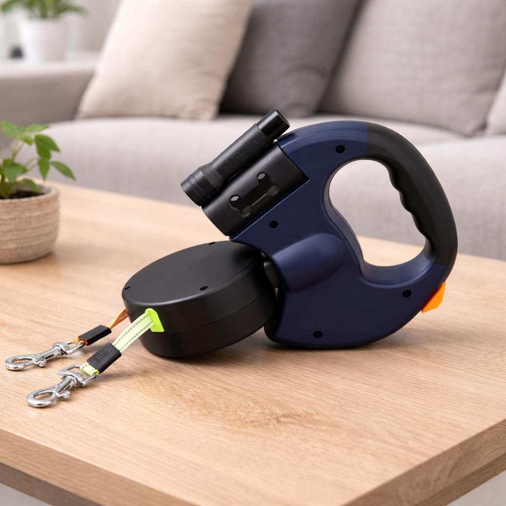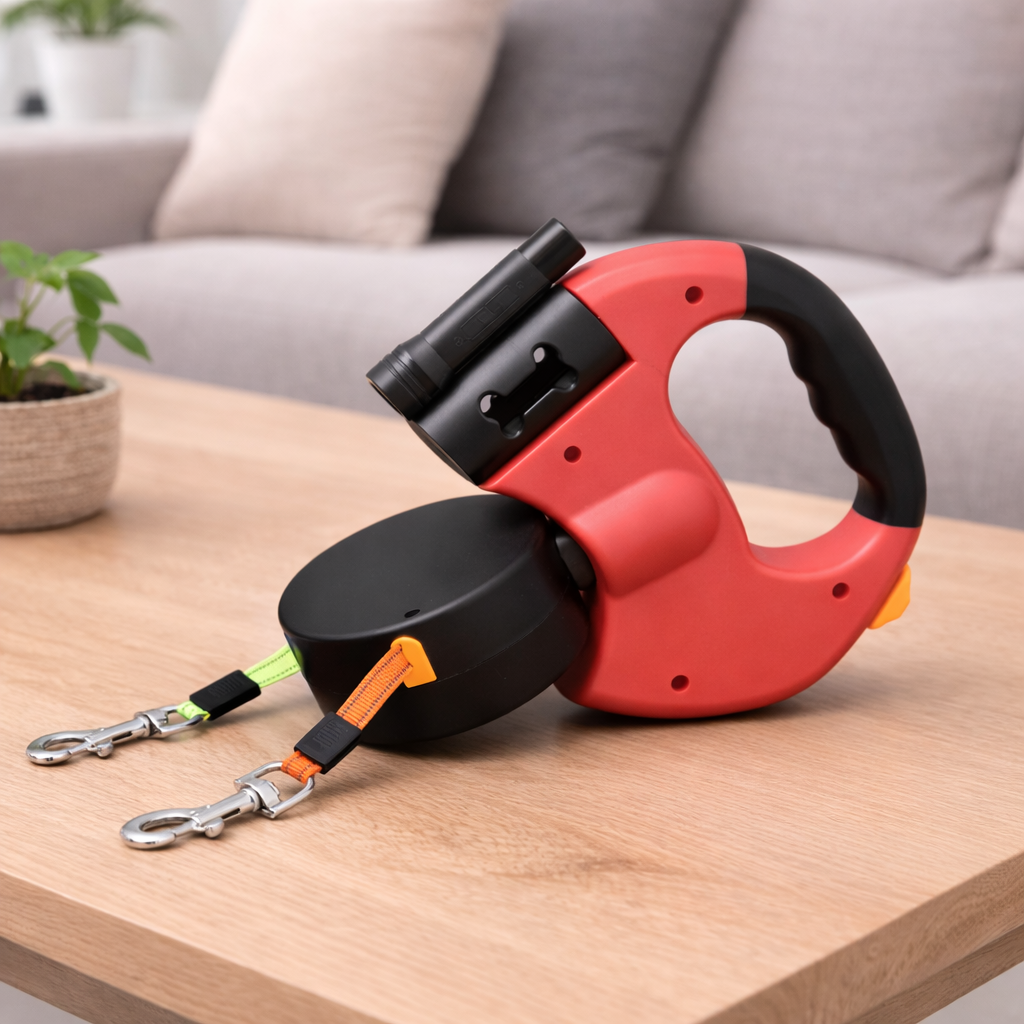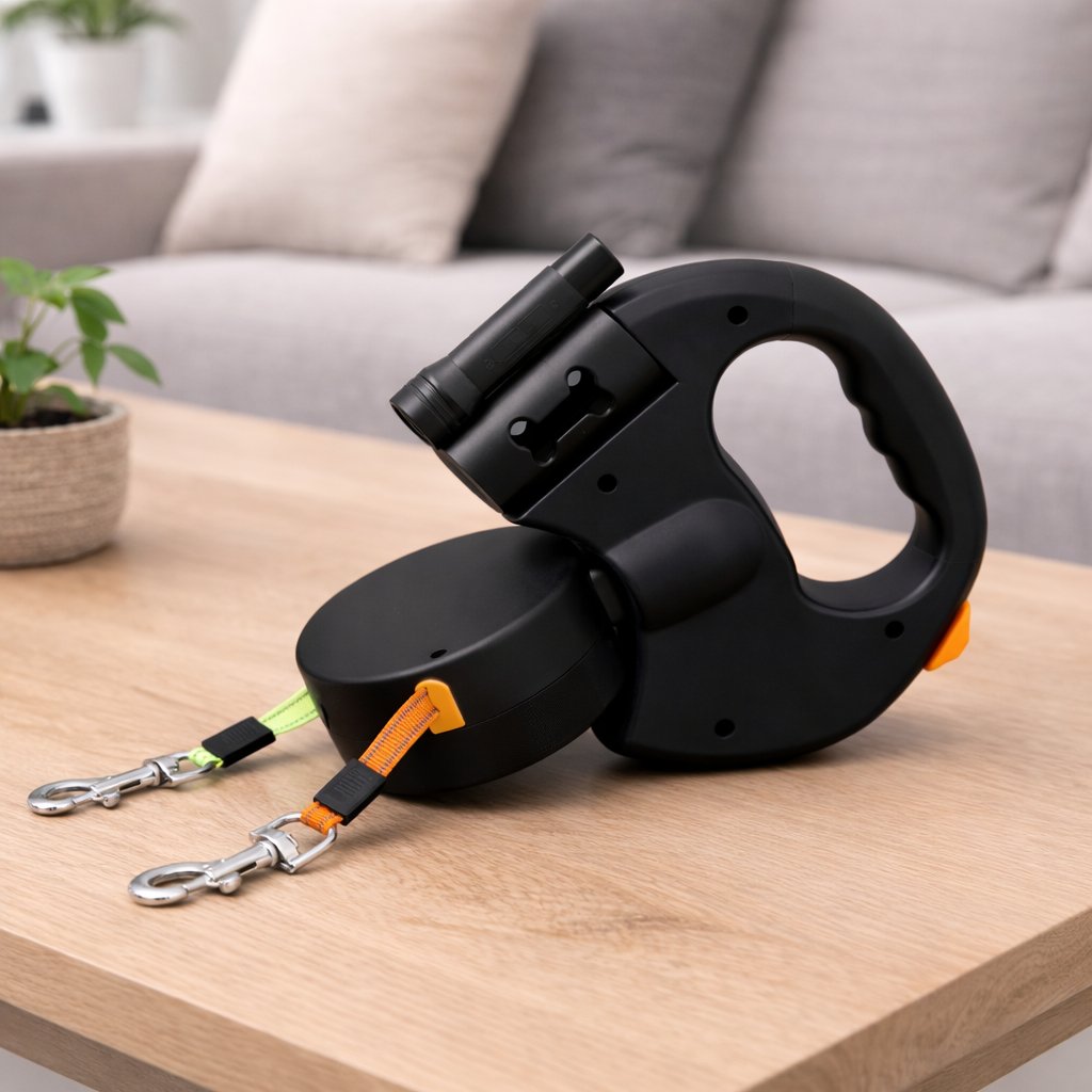 Il guinzaglio doppio avvolgibile con torcia LED ti permette di portare a spasso entrambi i cani con una sola mano, mantenendo controllo, sicurezza e visibilità in ogni momento.